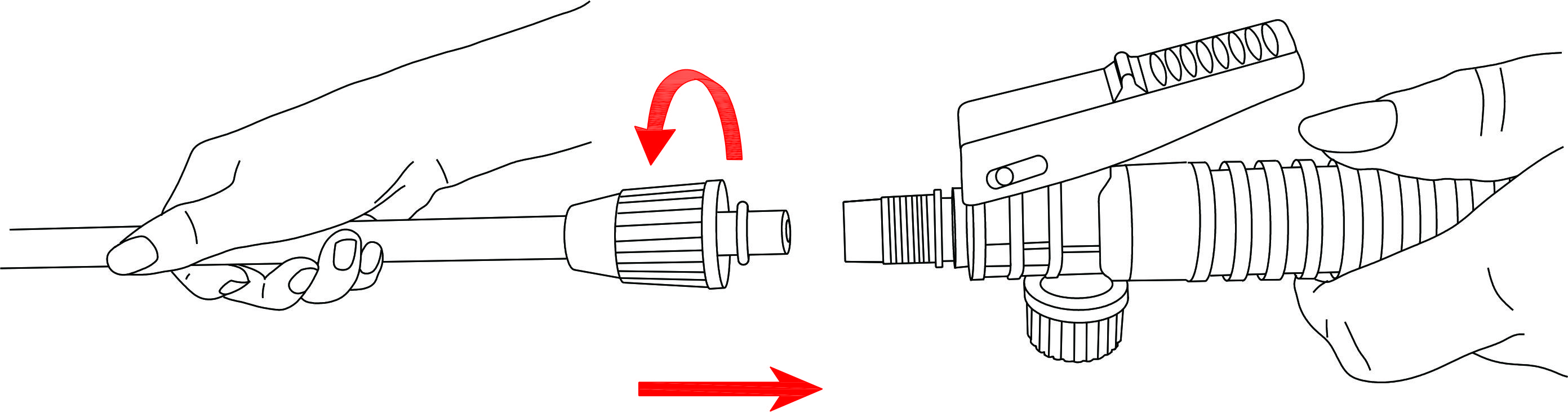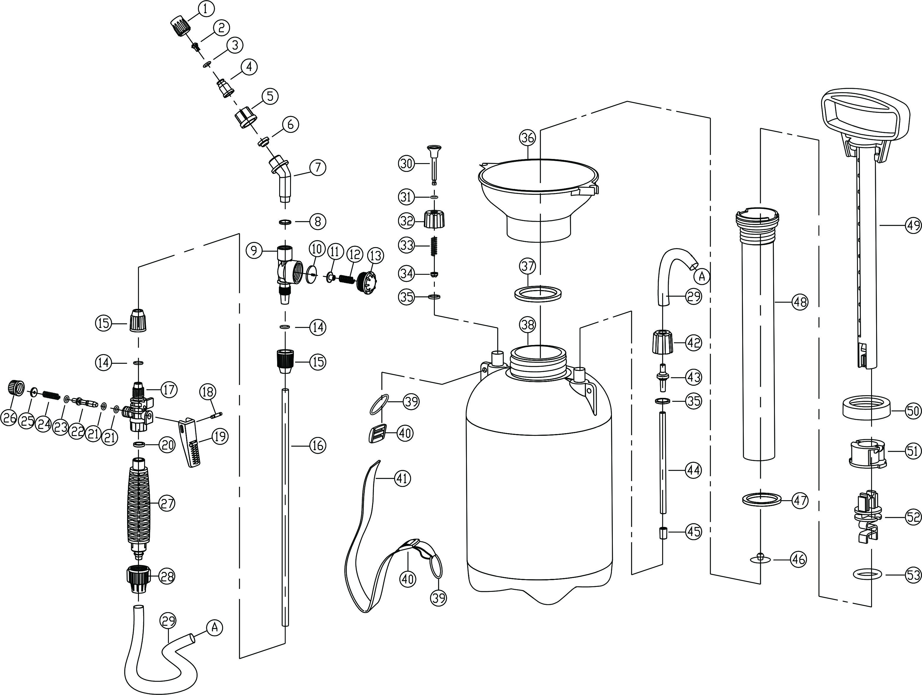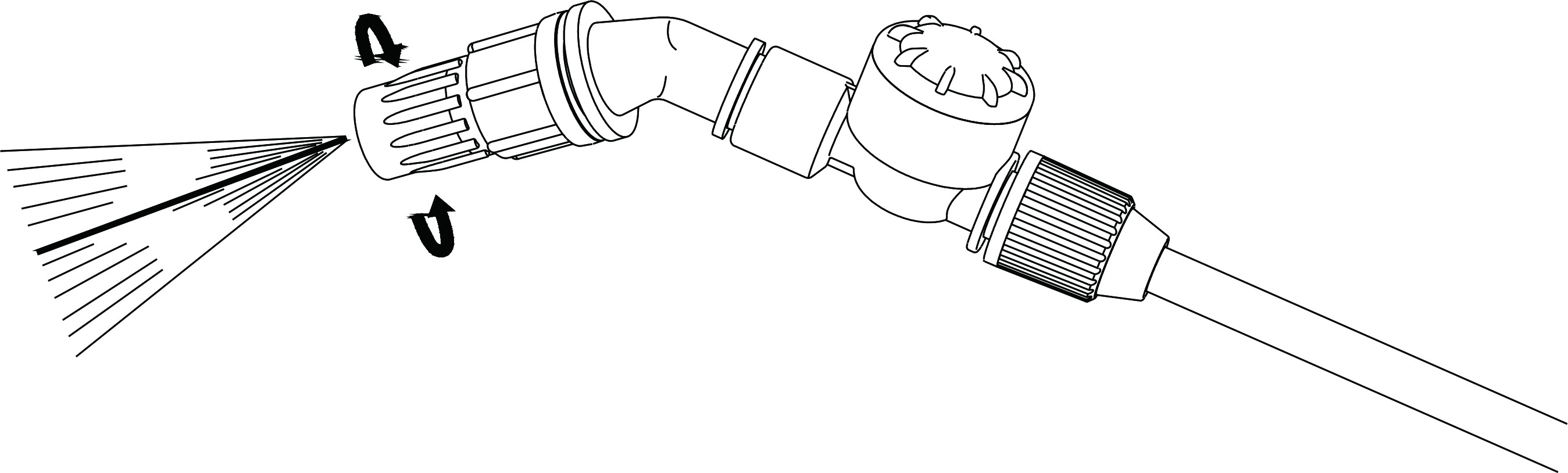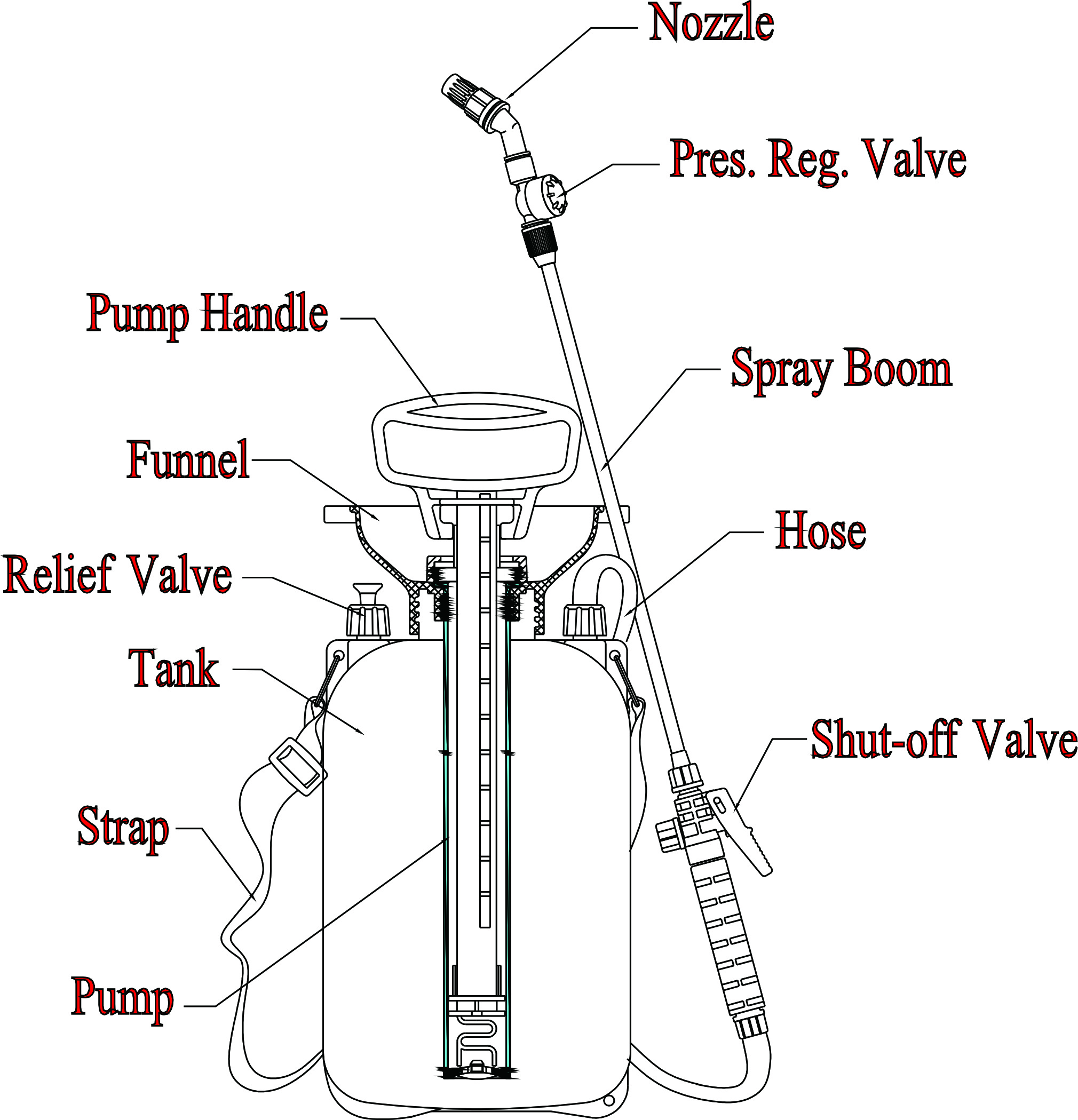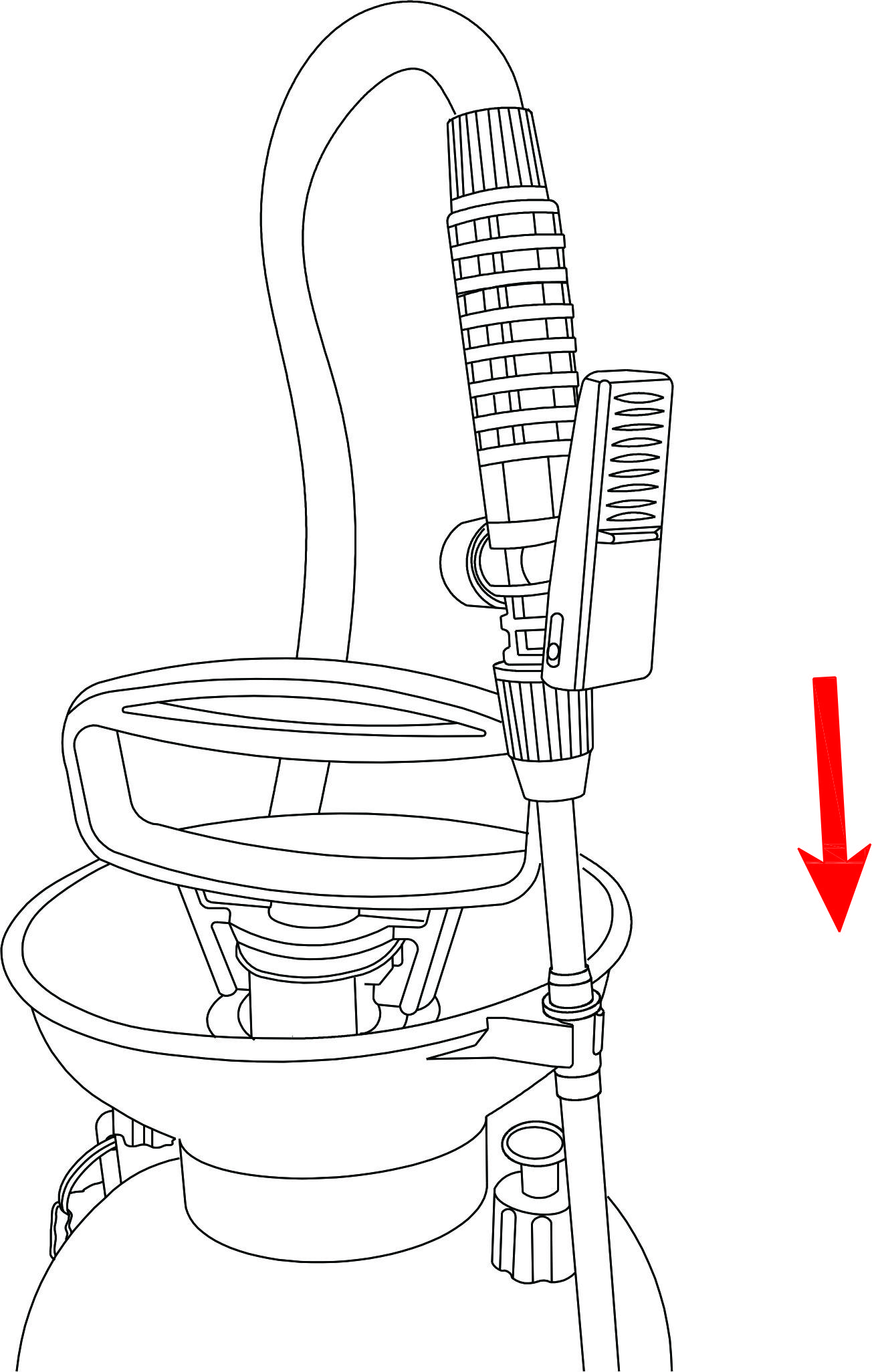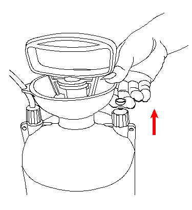 调压阀为常闭型,开启压力设定为1.4±0.2bar,关闭压力设定为1±0.15bar。当罐内压力增加到高于设定的打开压力时,喷雾机通过按住截止阀开始喷雾。当压力低于关闭压力时,调节阀自行关闭,停止喷射。如果您则应给水箱充气。 想继续喷涂,