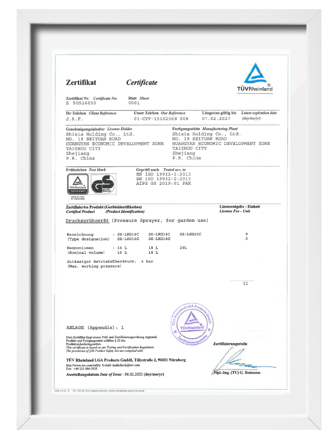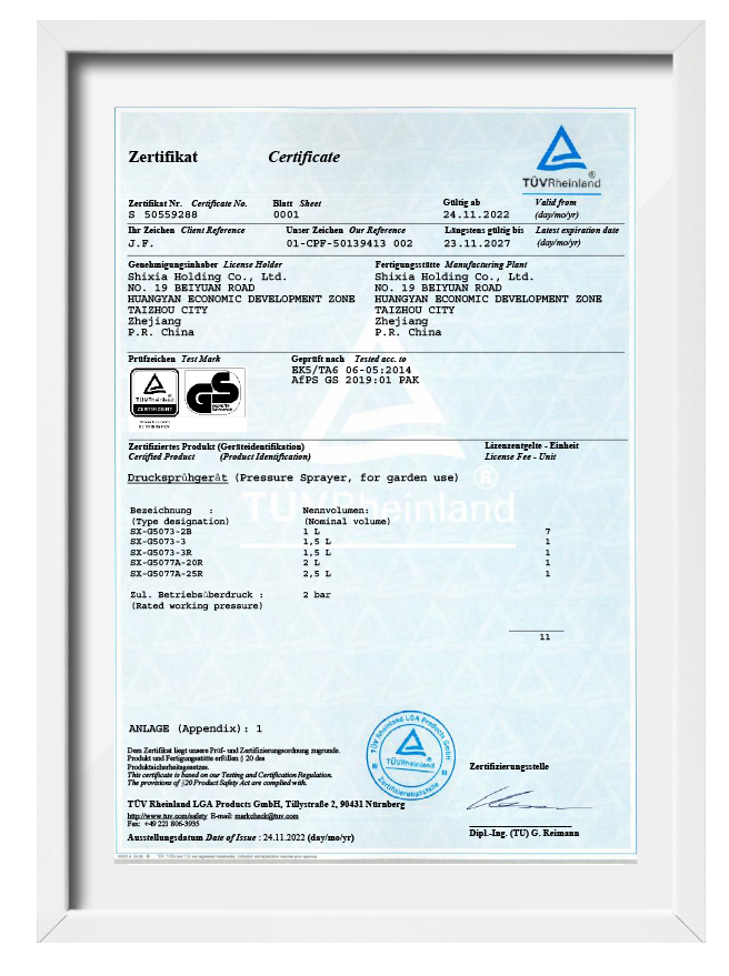2016年,产品通过“浙江制造认证”。 2016年7月,喷雾器产品获得亚洲国家首张CE+GS证书。世夏控股是奥尔多国内喷雾器认证很多的高端制造商。